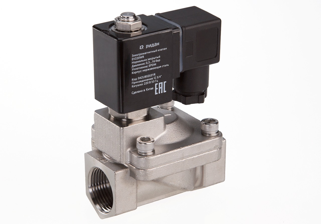 Ридан 042U802002R — Клапан электромагнитный EV220WR, присоединение G 3/4, материал уплотнения EPDM, нормально закрытый, 0,3…16 бар, с катушкой 24 В, постоянный ток